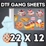 DTF gang sheet 4 color process film printing only on a 22" x 12" to 23'' size.  You can order multiple sheets of the same design.  DTF can be applied to 100% cotton, 100% polyester, poly blend, tote bags, clear bags, jeans, leather, and many more.